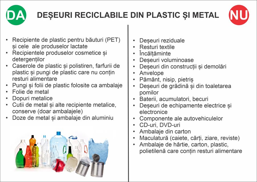 - În aceste recipiente se depoziteaza numai deșeurile reciclabile din PLASTIC și METAL!