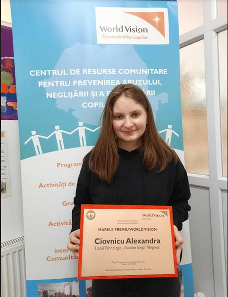 ”Media semestrială de 10 a fost un țel pe care Alexandra și l-a stabilit când a intrat la liceu. Totuși, în semestrul al doilea de anul trecut, din cauza pandemiei care a mutat școala în mediul online, accesul Alexandrei la educație a fost limitat brusc la un smartphone și date mobile. Dar acestea nu ar fi fost o piedică dacă semnalul nu ar fi fost inexistent. În absența semnalului Alexandra nu a putut participa la întâlnirile de pe zoom. Prin urmare, lecțiile zilnice au fost ca niște puzzle-uri. După o perioadă grea de mărit pozele pe telefonul mobil pentru a copia lecțiile, fundația i-a venit în ajutor cu o tabletă și, ulterior, cu un laptop. Alexandra merită marele premiu World Vision deoarece, în ciuda greutăților, a fost perseverentă la școală și mereu extrem de implicată în programele de voluntariat ale fundației. A ajutat săptămânal timp de doi ani de zile colegi de gimnaziu cu temele la matematică și la limba română prin proiectul Care and Protect. Încă menține legătura cu toți elevii pe care i-a meditat și le-a devenit un mentor celor care au intrat la liceu”.