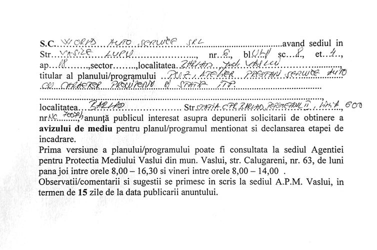 Acasă Publicitate Anunț Aviz mediu SC World Auto Service SRL
