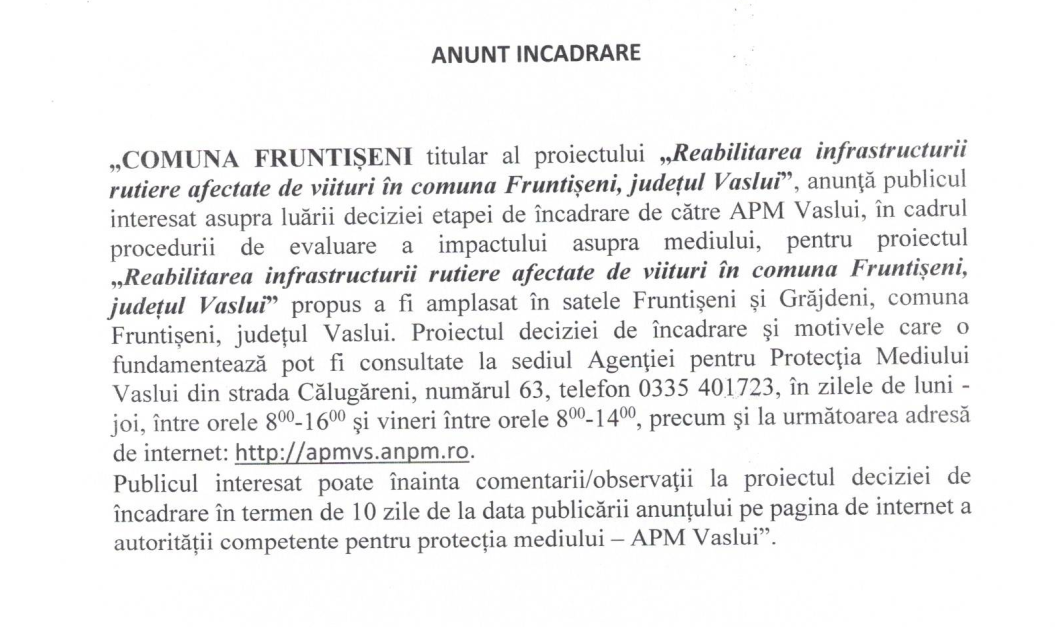 Anunț încadrare APM Vaslui a proiectului ”Reabilitarea infrastructurii rutiere afectate de viituri în comuna Fruntișeni