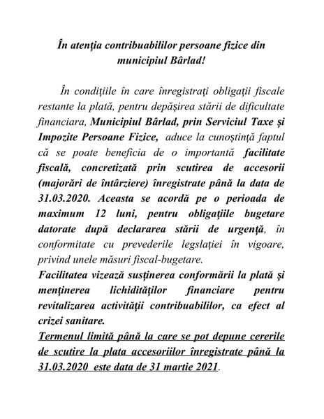 Potrivit unei hotărâri a Consiliului Local Bârlad, cetățenii municipiului Bârlad au șansa de a scăpa de plata majorărilor de întârziere, cu condiția să depună o cerere în acest sens, la Serviciul de taxe și impozite persoane fizice din cadrul Primăriei Bârlad.