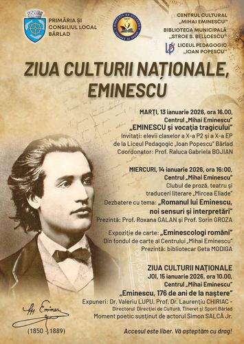 Bârladul marchează Ziua Culturii Naționale printr-o serie de manifestări programate în perioada 13–15 ianuarie 2026, la Centrul Cultural „Mihai Eminescu”. Evenimentele sunt organizate cu implicarea Primăriei și Consiliului Local Bârlad, alături de instituții culturale și educaționale locale, iar accesul publicului este liber.