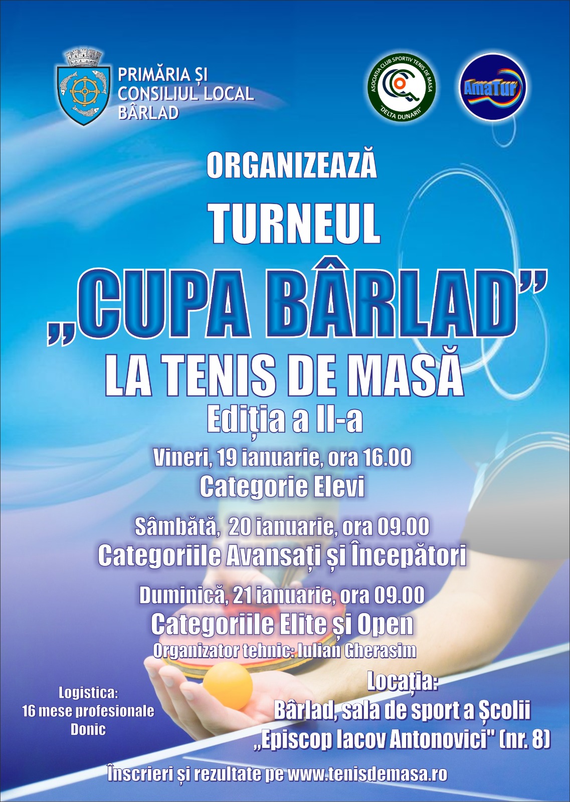 Ca și anul trecut, Turneul ”Cupa Bârlad” la tenis de masă, ediția a II-a este organizată de Primăria și Consiliul Local Bârlad, Asociația Club Sportiv Tenis de Masă ”Delta Dunării” și AmaTur, iar organizatorul tehnic este Iulian Gherasim.