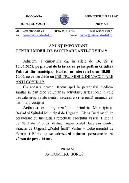 Primarul Dumitru Boroș a lansat un apel către medicii și asistenții medicali din Bârlad, de a se implica voluntar în acțiunea de vaccinare desfășurată pe parcursul celor trei zile în cadrul centrului mobil (facsimil). (Simona MIHĂILĂ)