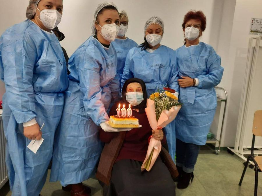 Personalul centrului de vaccinare de la Școala ”Episcop Iacov Antonovici” a așteptat-o cu flori și tort, comandate special pentru bătrânică.