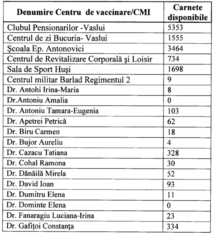 – la data curenta in judetul Vaslui sunt disponibile un numar de 18096 camete continand fiecare 5 tichete de masa In valoare de 20 RON, dintre care 16461 sunt alocate centrelor de vaccinare si cabinetelor medicilor de familie vaccinatori, astfel: