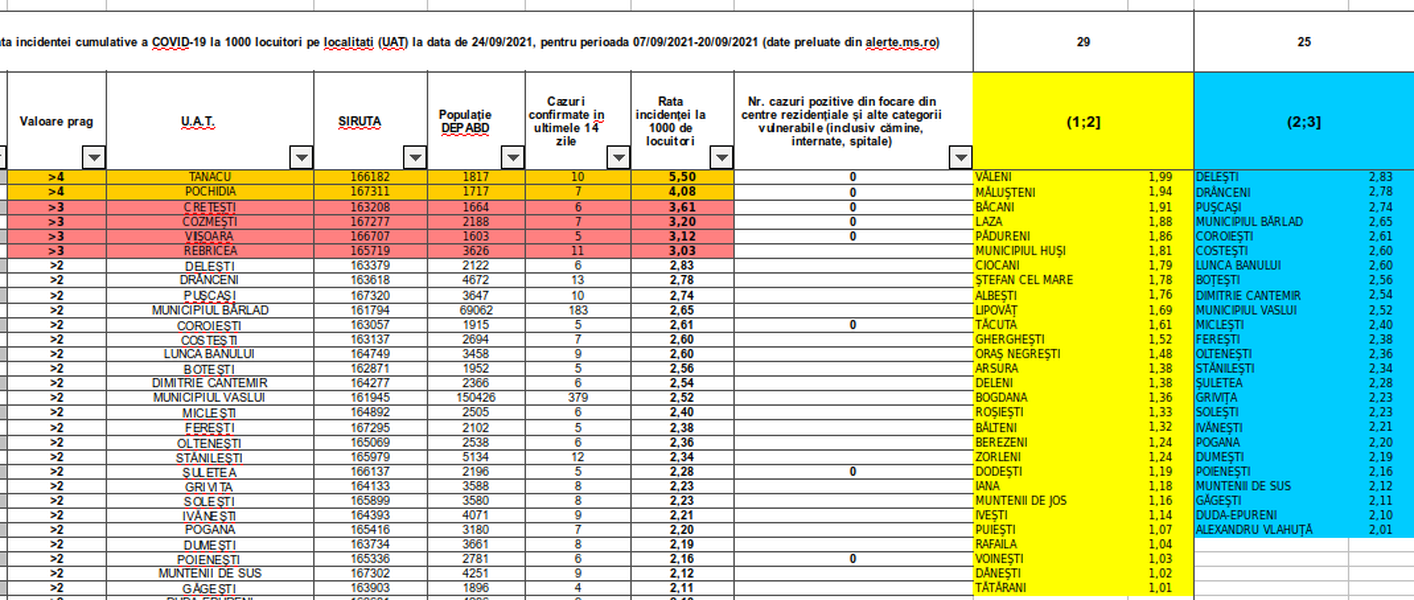 Numărul cazurilor de infectare cu Covid-19 a explodat în municipiile Bârlad și Vaslui. Potrivit informării făcute de Direcția de Sănătate Publică Vaslui, rata incidenței cumulative la 1.000 de locuitori, a crescut în ultimele 14 zile, așa încât Bârladul a ajuns la o rată de infectare de 2,65 la mia de locuitori (față de 0,94, cât era în urmă cu două săptămâni), iar Vasluiul cu 2,52, față de 1,94.