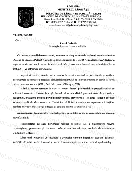 În urma apariției articolului în care Ziarul Obiectiv a prezentat cazul pacientului din Bârlad care s-a vindecat de COVID, dar care a fost ucis de Clostridium chiar pe patul de la ATI (unde se și infectase), DSP Vaslui s-a autosesizat.