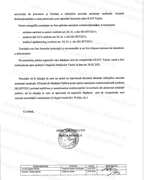 Aceeași sancțiune a fost aplicată și pentru o altă neregulă: ”Lipsa unei proceduri de raportare a deceselor datorate infecțiilor intraspitalicești (…), către medicul epidemiolog al serviciului de prevenire și limitare a infecțiilor”.