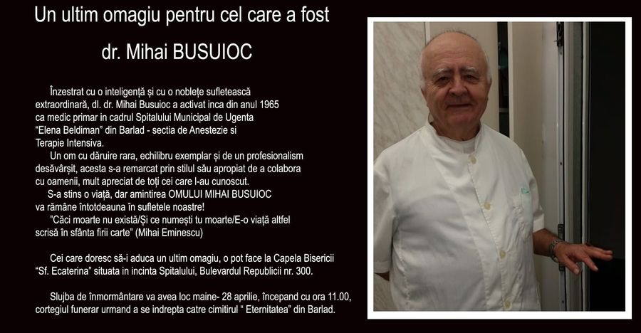 Ziua de miercuri, 28 aprilie, este ultima în care bârlădenii își pot lua rămas-bun de la doctorul Mihai Busuioc, printre cei din urmă medici ai generației de aur ce a slujit spitalul de la Bârlad.