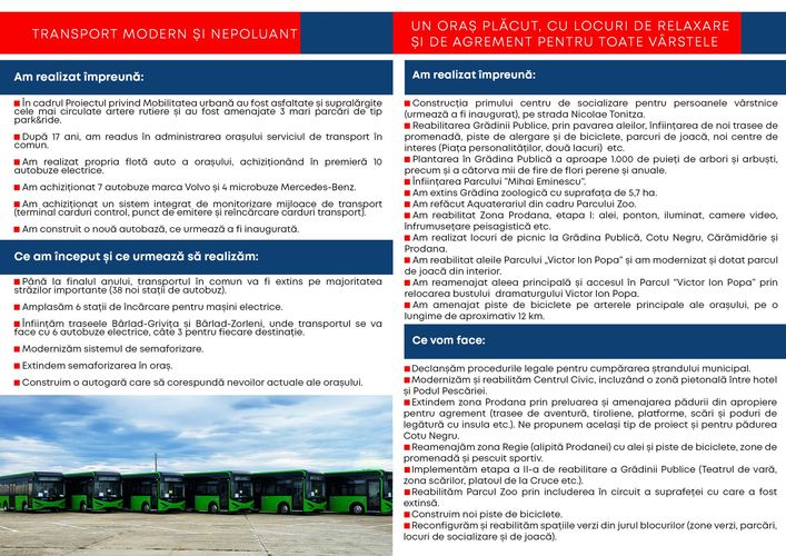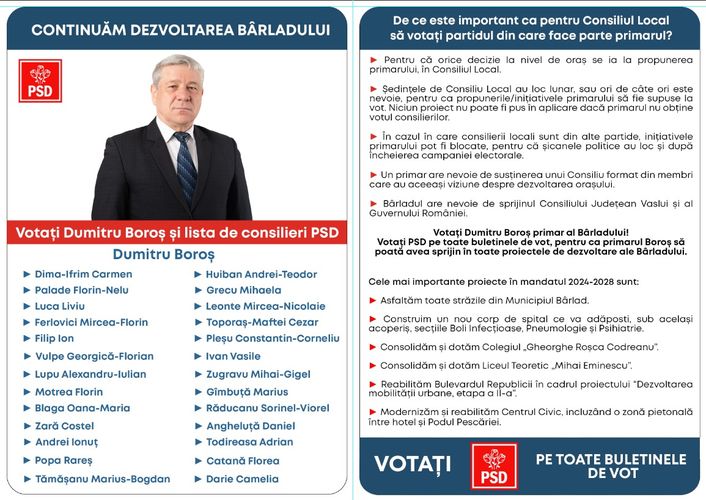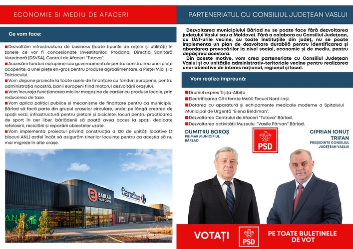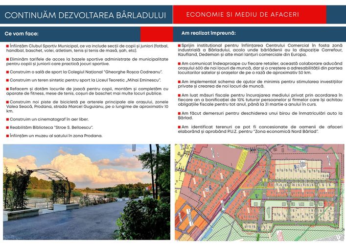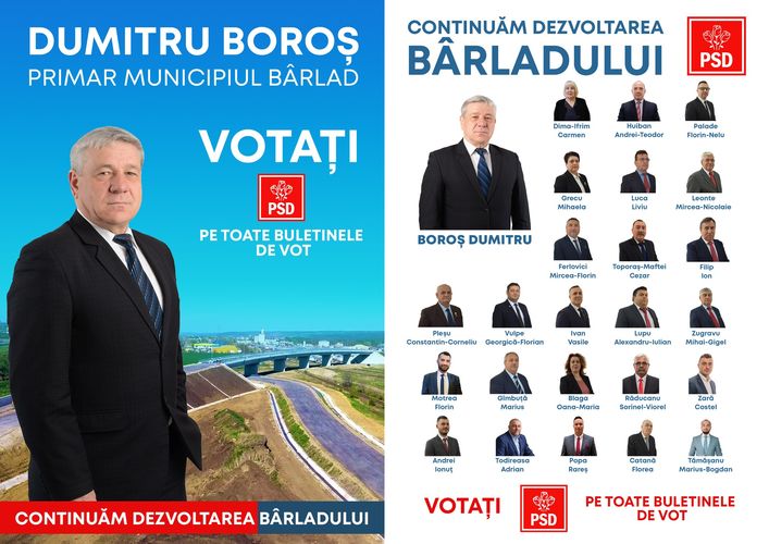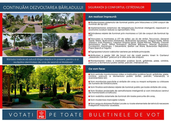 Tot ce mai trebuie este ca la alegerile de pe 9 iunie să ne oferiți, mie și echipei mele, șansa de a desăvârși povestea frumoasă a evoluției Bârladului spre orașul civilizat, îngrijit și aerisit pe care ni-l dorim cu toții.