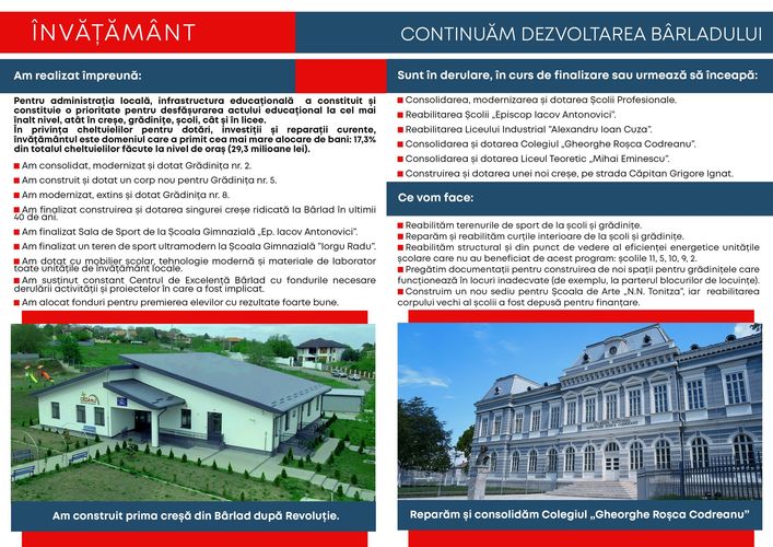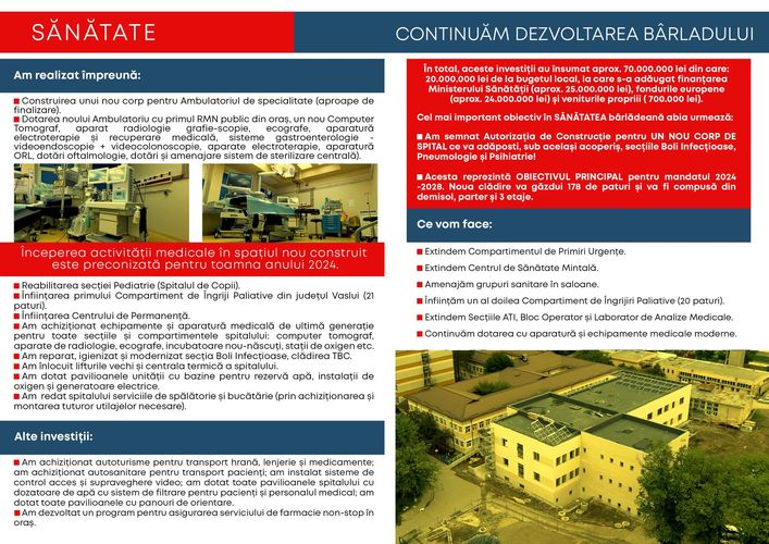 Avem în lucru proiecte importante pentru dezvoltarea Bârladului, pe care le regăsiți în cele ce urmează, grupate pe domenii. Vă îndemn să le analizați și să aveți în vedere că pentru înfăptuirea lor, de această dată avem și sprijinul politic necesar.