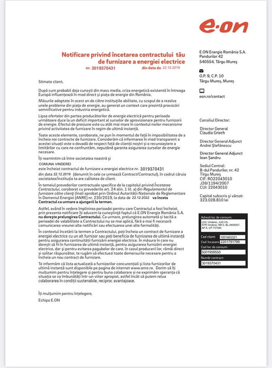”Din păcate, veștile nu sunt bune! Astăzi am primit de la furnizorul de energie electrică, E.ON România, notificările de reziliere a contractelor de furnizare pentru iluminatul stradal, Gradinita Vinderei, sediul Primăriei Vinderei.