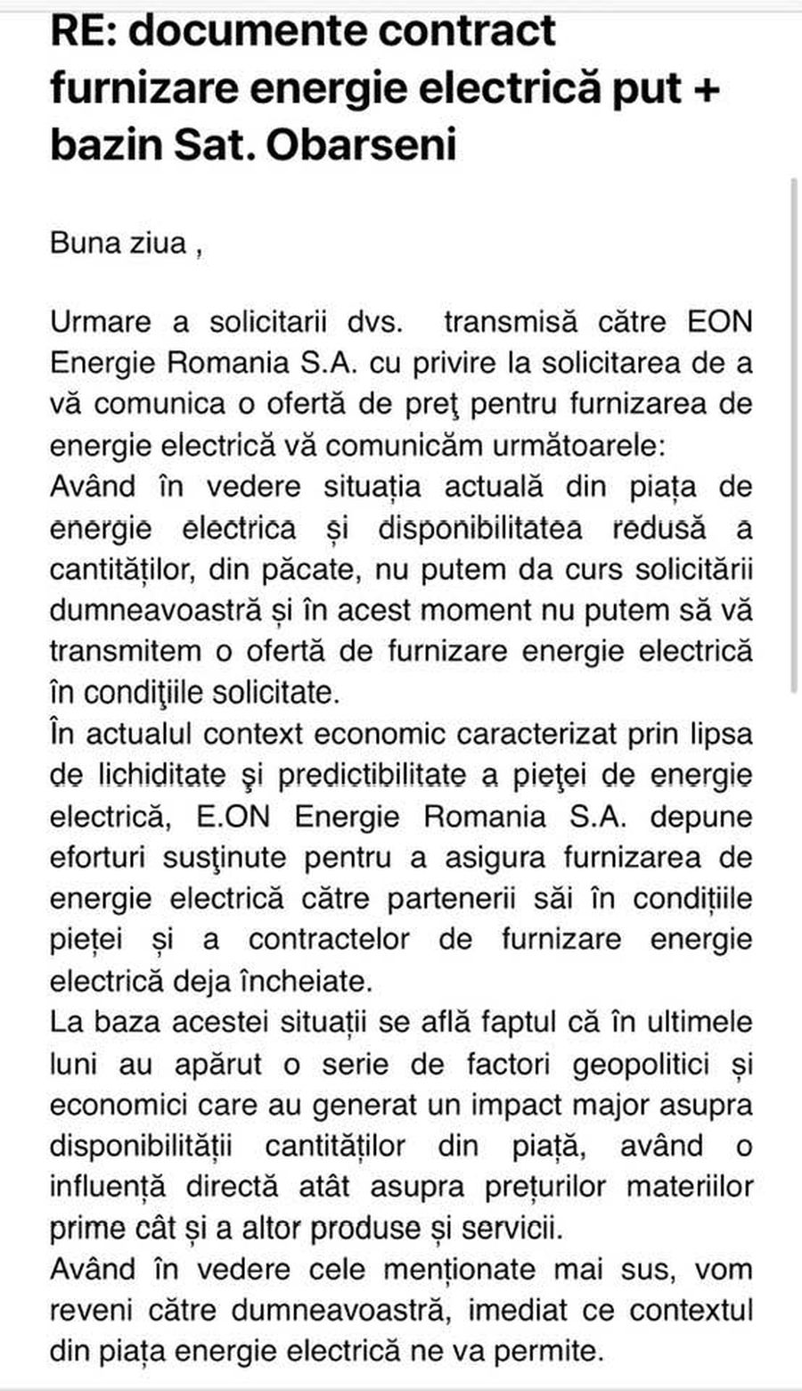 Potrivit documentelor, E.ON motivează refuzul de a încheia un nou contract de furnizare cu faptul că sursele de energie se află în deficit (vezi foto).