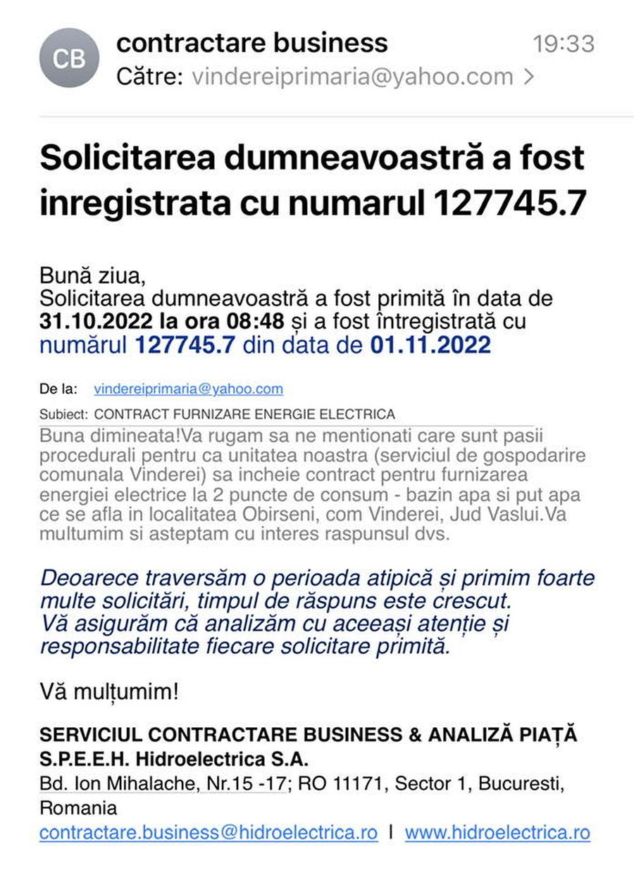 De asemenea, pentru branșamentele puțurilor și bazinului de apa de la Obarseni, ne-a fost refuzata semnarea contractului de furnizare, ceea ce va duce la imposibilitatea furnizării apei potabile in acest sat. După o investiție de 200.000 lei la bransamentul electric de alimentare a stației de epurare Vinderei, astăzi constatam ca niciun furnizor de energie electrică nu încheie contracte noi de furnizare, ceea ce va duce la imposibilitatea pornirii stației de epurare și implicit racordarea gospodăriilor la sistemul de canalizare. In acest moment, noi nu mai avem soluții, iar rezolvarea acestei probleme, cu care se confrunta toată România, sta in puterea Guvernului!, a transmis primarul comunei Vinderei pe pagina sa de socializare.