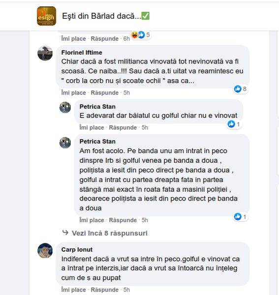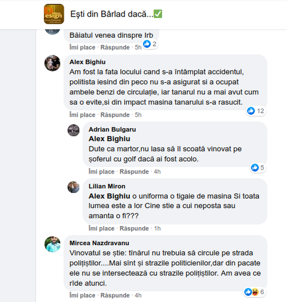 Declarația lui este susținută și de A.B., un alt internaut: ”Am fost la fata locului cand s-a întâmplat accidentul, politista iesind din Peco nu s-a asigurat si a ocupat ambele benzi de circulație, iar tanarul nu a mai avut cum sa o evite. Din impact, masina tanarului s-a rasucit”.