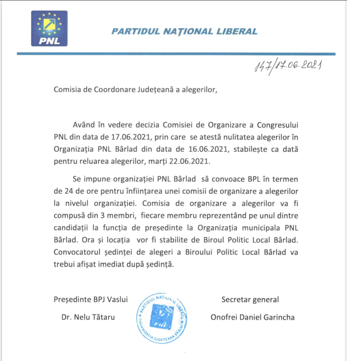 Alegerile desfășurate la PNL Bârlad miercuri, 16 iunie, în urma cărora Dumitru Boroș a primit încă un mandat în fruntea organizației, nu au fost anulate, așa cum afirmă gruparea lui Nelu Tătaru, președintele pe județ al PNL.