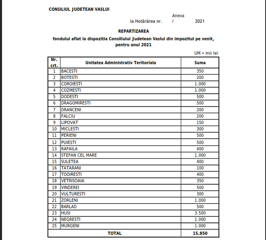 Potrivit proiectului de hotărâre, cei mai mulți bani îi va primi municipiul Huși – 3, 5 milioane lei, urmat de orașele Negrești și Murgeni, precum și comunele comunele Coroiești, Cozmești, Ștefan cel Mare și Zorleni care vor primi câte 1 milion de lei.