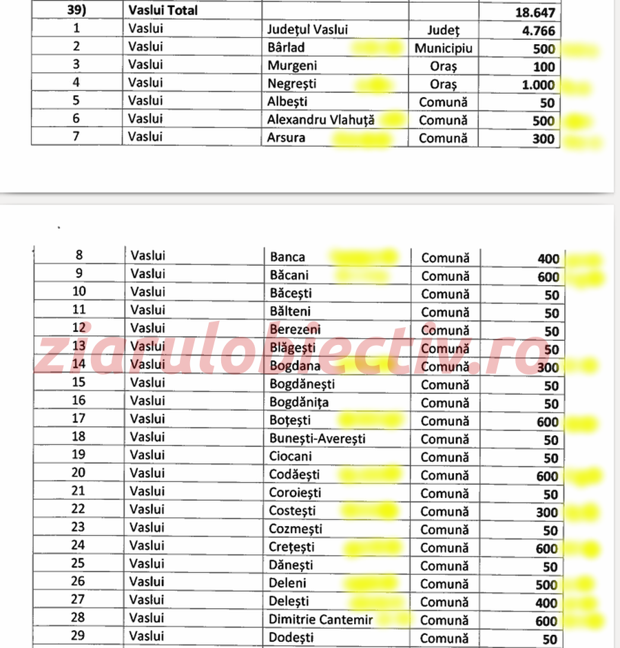 În realitate, în județul Vaslui, primăriile conduse de primari PSD au primit și de 10 ori mai puțin decât cele conduse de primari PNL, iar cele patru comune cu primari ALDE (Puiești, Vinderei, Perieni și Dragomirești) nu au primit niciun leu! Tot zero lei au primit și locuitorii municipiului Huși, precum și cei ai municipiului Vaslui.