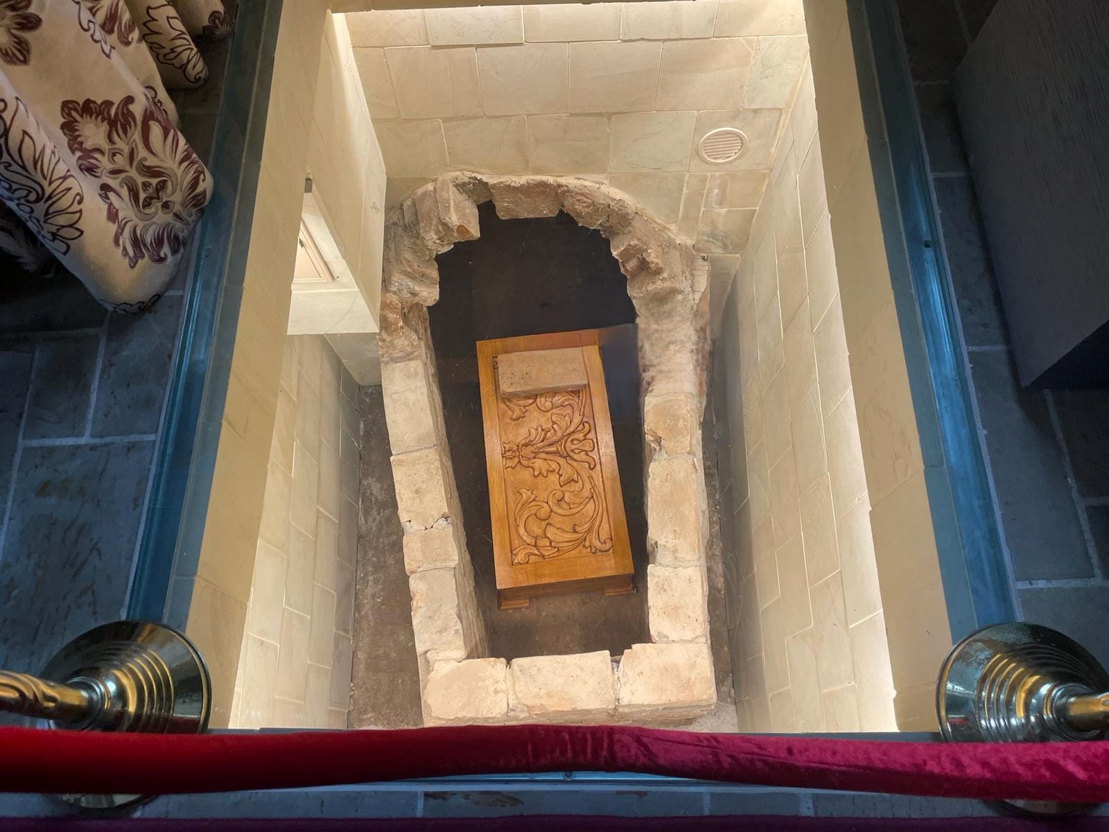 Preotul nu a vrut ca mormântul să rămână ascuns privirilor. În dreptul său, pardoseala este din sticlă în așa fel încât interiorul și sicriul să fie vizibile. A montat aparate care să țină sub control umiditatea.