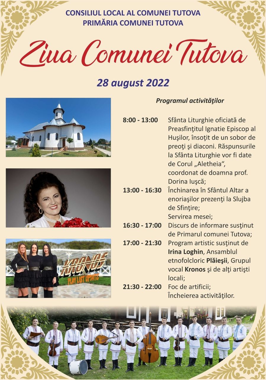 Locuitorii comunei Tutova se pregătesc de sărbătoare. Pe 28 august, cu mic cu mare, tutovenii sunt chemați de edilii locali să ia parte la sărbătoarea comunei, un eveniment în care momentele de reculegere spirituală se vor reuni deopotrivă cu veselia, cu voia-bună și cu bucuria revederii dintre cei plecați la muncă peste hotare și cei rămași acasă.