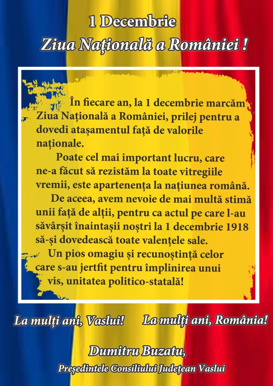 Acasă Local Mesajul președintelui Consiliului Județean Vaslui, Dumitru Buzatu, cu ocazia zilei de 1...
