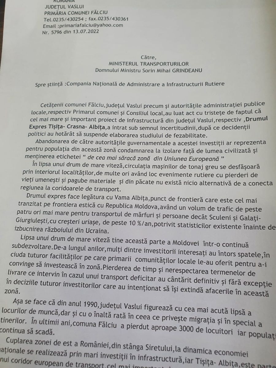 Așa se face că din 1990 județul Vaslui figurează cu cea mai acută lipsă a locurilor de muncă din țară, dar și cu o înaltă rată în ceea ce privește migrația”, se arată în memoriul trimis de Primăria comunei Fălciu la Ministerul Transporturilor și la CNAIR.
