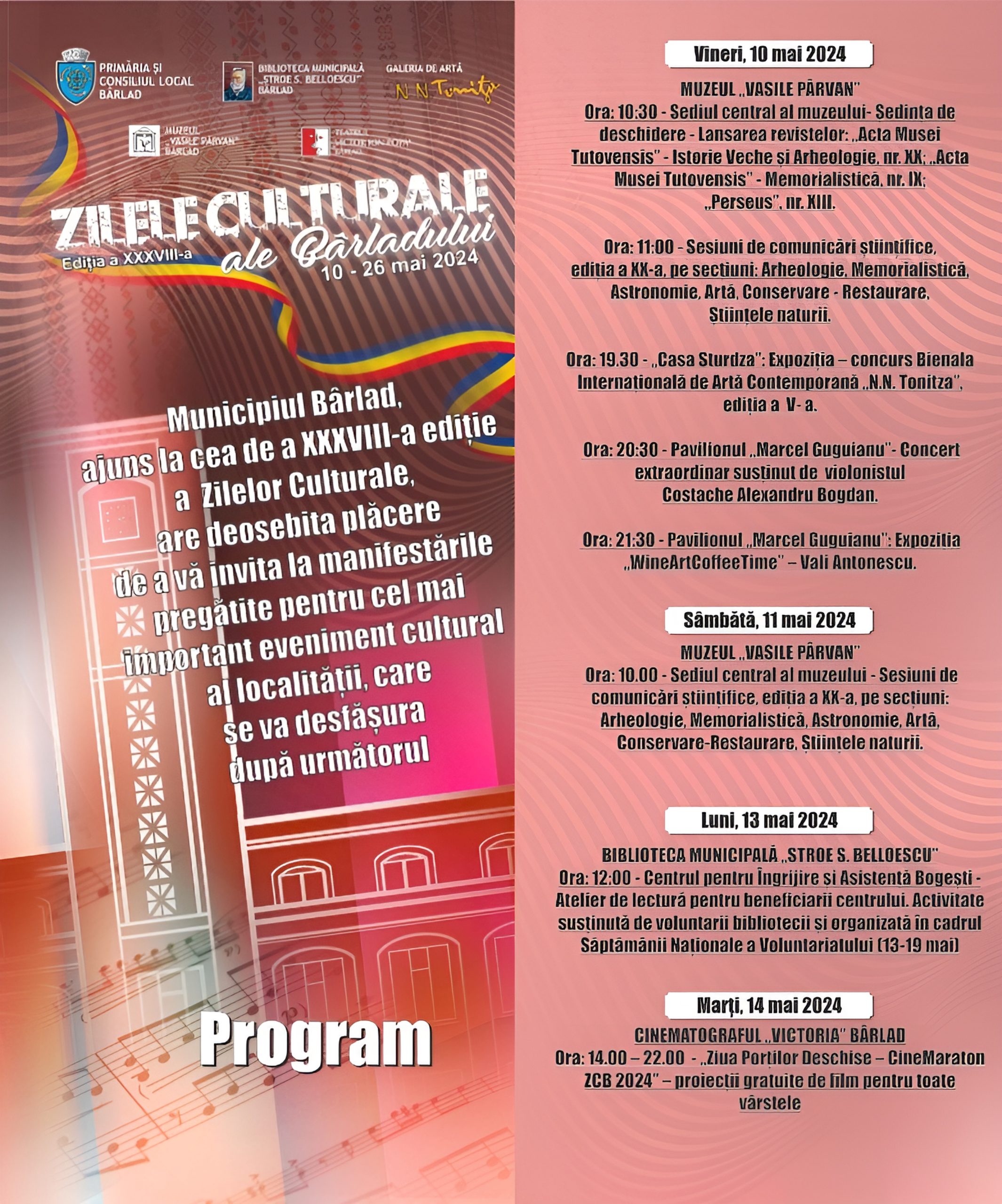 Cea de a XXXVIII-a ediție a Zilelor Culturale ale Bârladului se desfășoară în perioada 10 – 26 mai.