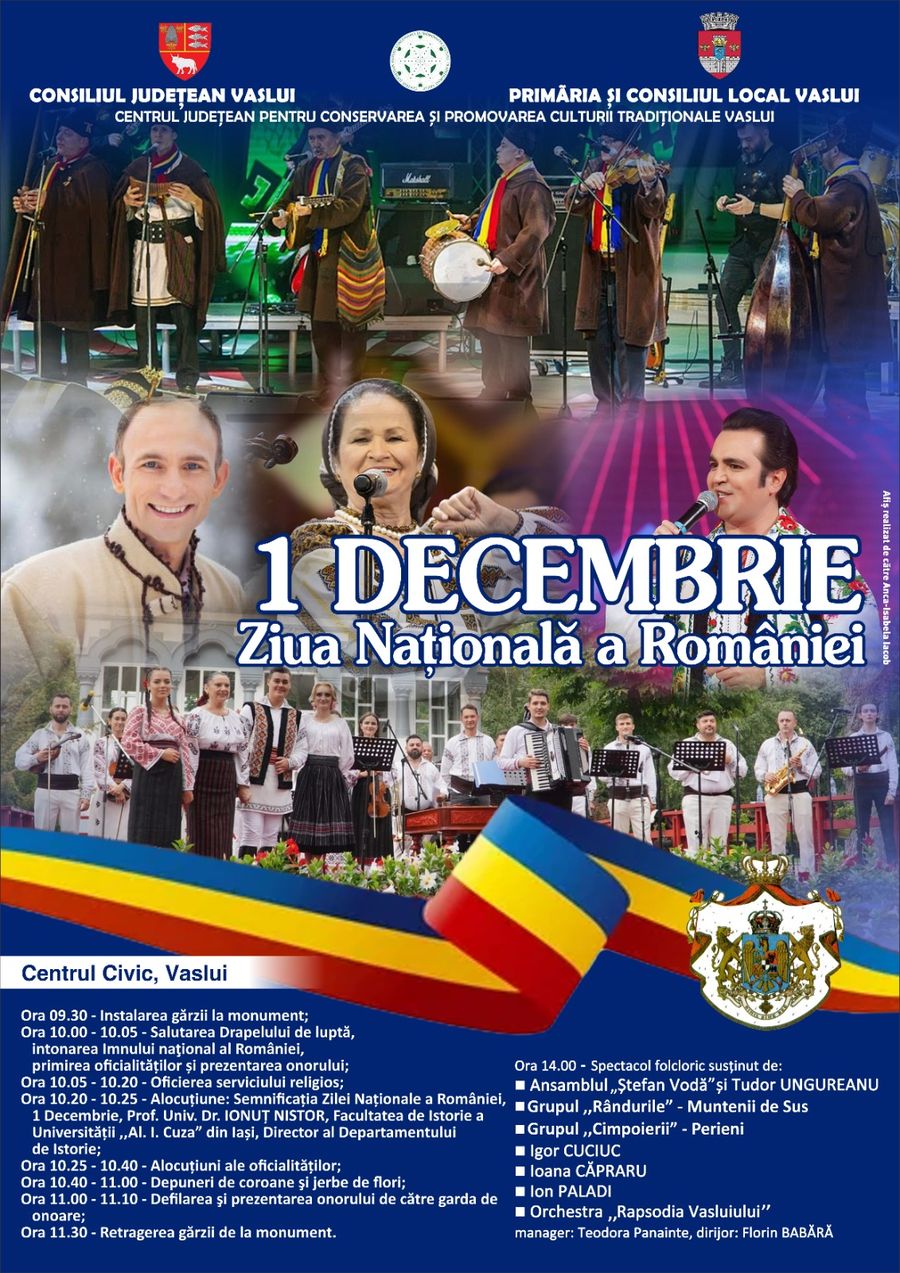 Ziua Națională a României va fi marcată în municipiul reședință de județ printr-un program de activități organizat de Consiliul Județean Vaslui și de Primăria Vaslui. Vasluienii sunt invitați, așadar, la o serie de manifestări din care nu vor lipsi momentele culturale, dar nici distracția și voia-bună.