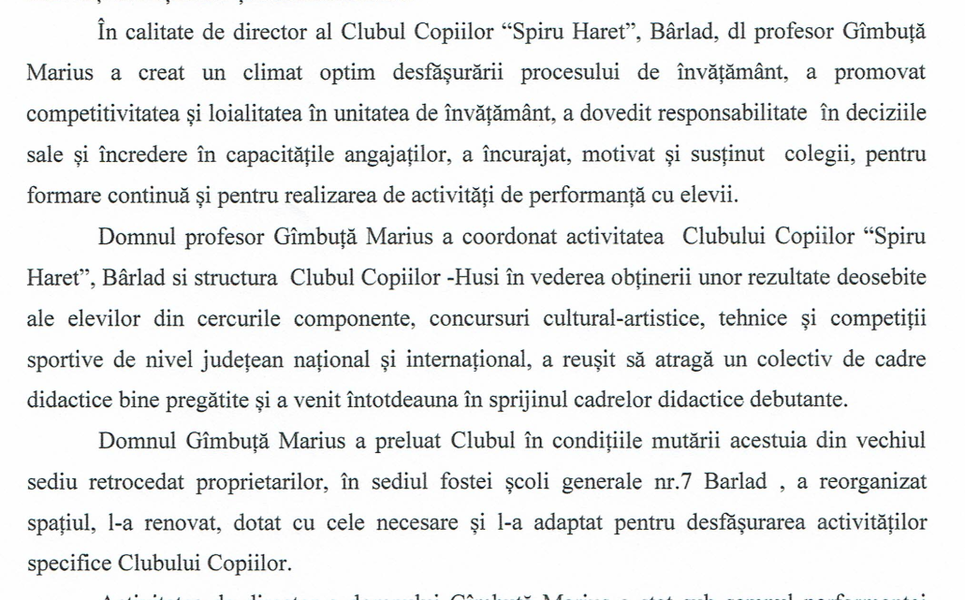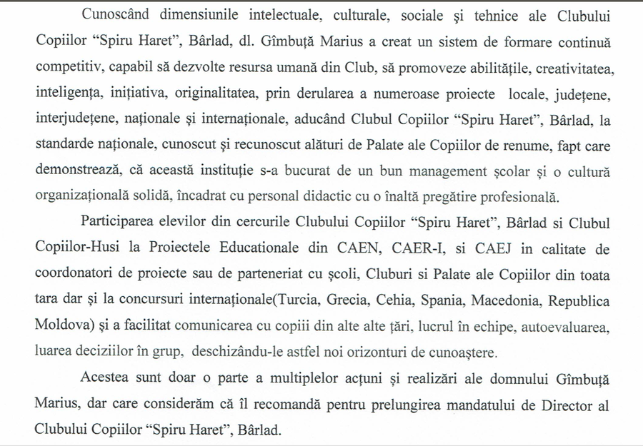 Zilele trecute, după ce au aflat că liberalii împreună cu oamenii din fruntea ISJ plănuiesc să-i facă vânt, cadrele didactice de la Clubul copiilor Bârlad și Clubul Copiilor Huși au trimis la inspectorat un memoriu prin care au argumentat că înlăturarea lui Gîmbuță este o greșeală.