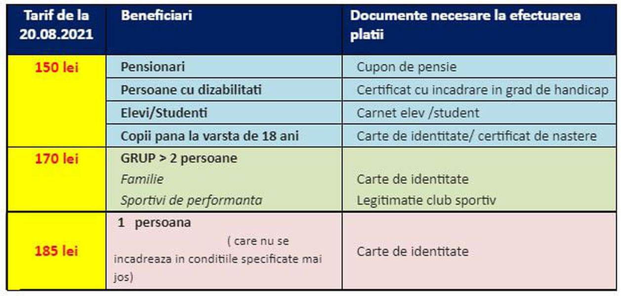 Tarifele sunt cuprinse în tabelul de mai jos:
