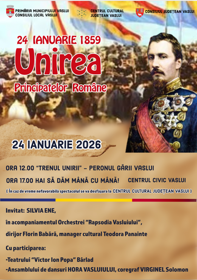 Vasluienii sunt așteptați de Primăria Municipiului Vaslui, pe 24 ianuarie, la manifestările dedicate Unirii Principatelor Române, cu două repere principale: evenimentul civic „Trenul Unirii” și spectacolul aniversar „HAI SĂ DĂM MÂNĂ CU MÂNĂ!”.